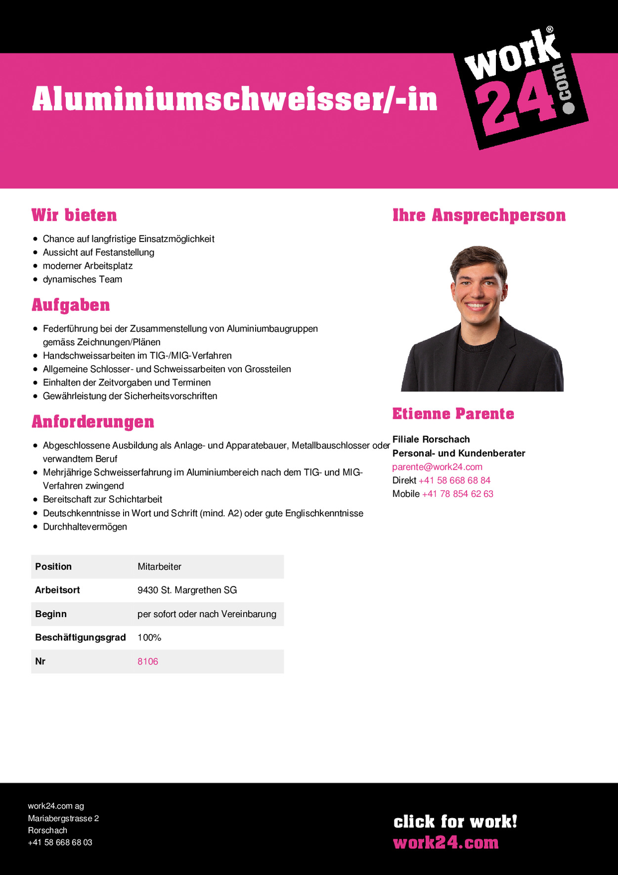 - Mehrjährige Schweisserfahrung im Aluminiumbereich nach dem TIG- und MIG-Verfahren zwingend