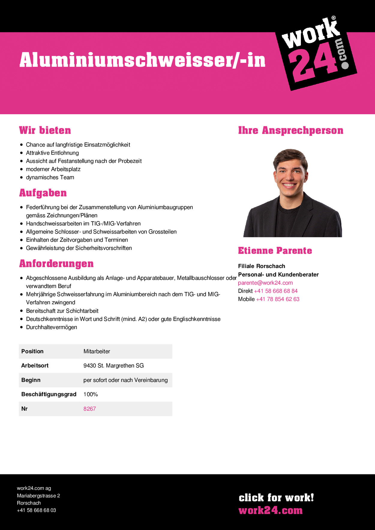 - Mehrjährige Schweisserfahrung im Aluminiumbereich nach dem TIG- und MIG-Verfahren zwingend
