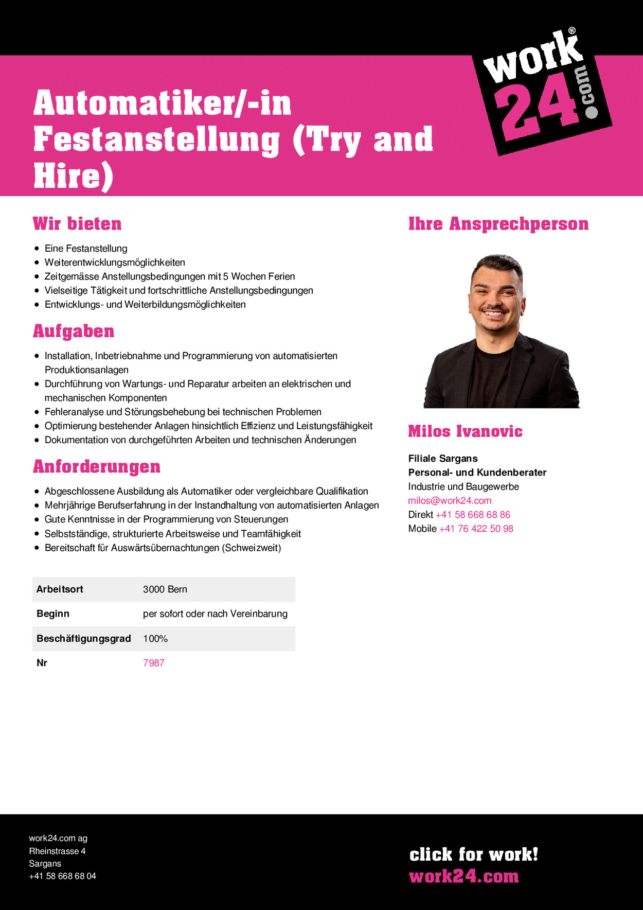 Automatiker/-in Festanstellung (Try and Hire) in Bern