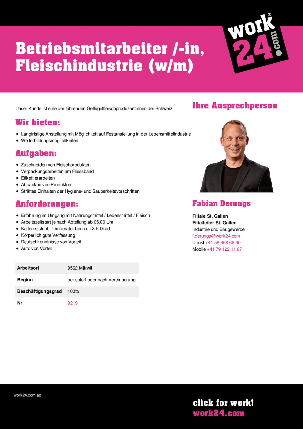 Betriebsmitarbeiter /-in, Fleischindustrie (w/m) in Märwil