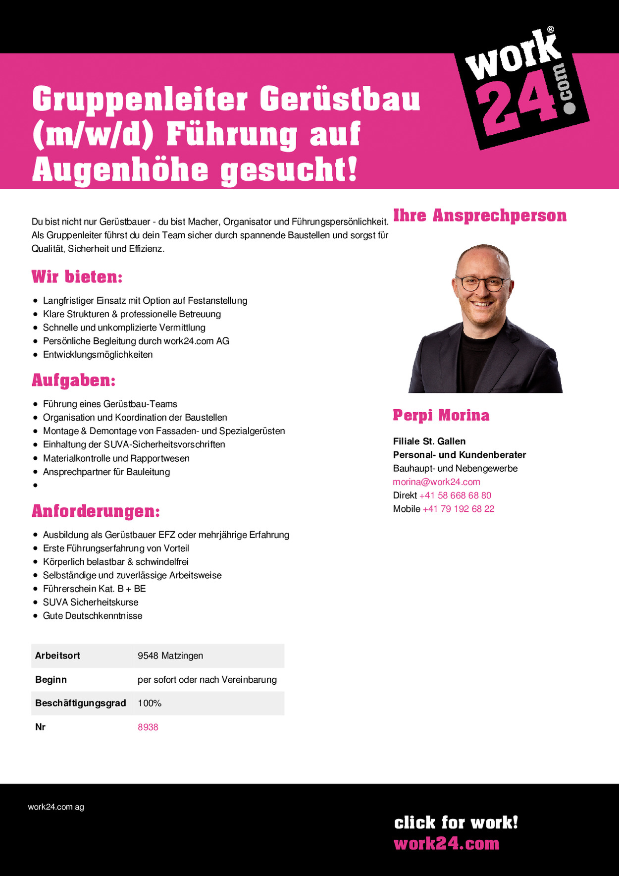 Du bist nicht nur Gerüstbauer - du bist Macher, Organisator und Führungspersönlichkeit. Als Gruppenleiter führst du dein Team sicher durch spannende Baustellen und sorgst für Qualität, Sicherheit und Effizienz.