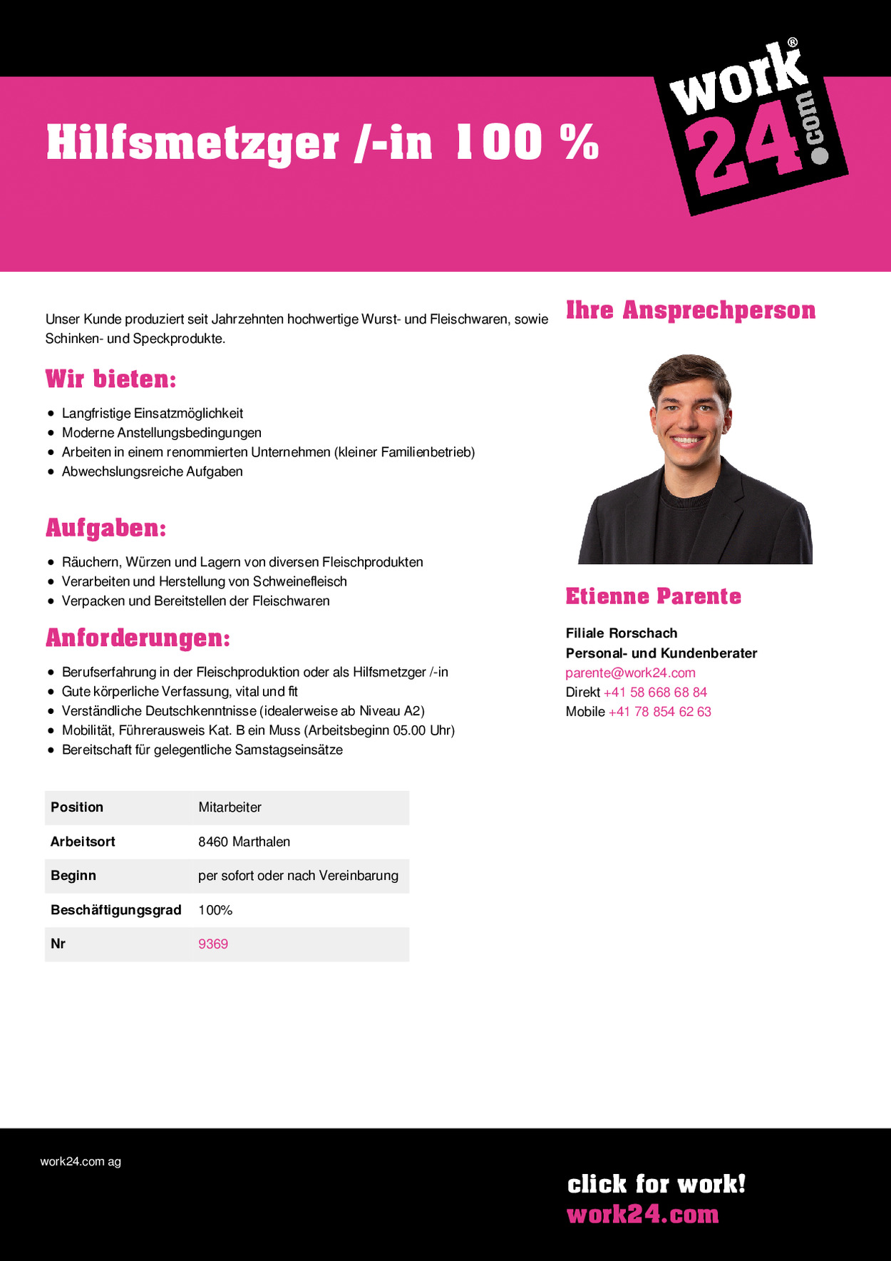- Berufserfahrung in der Fleischproduktion oder als Hilfsmetzger /-in