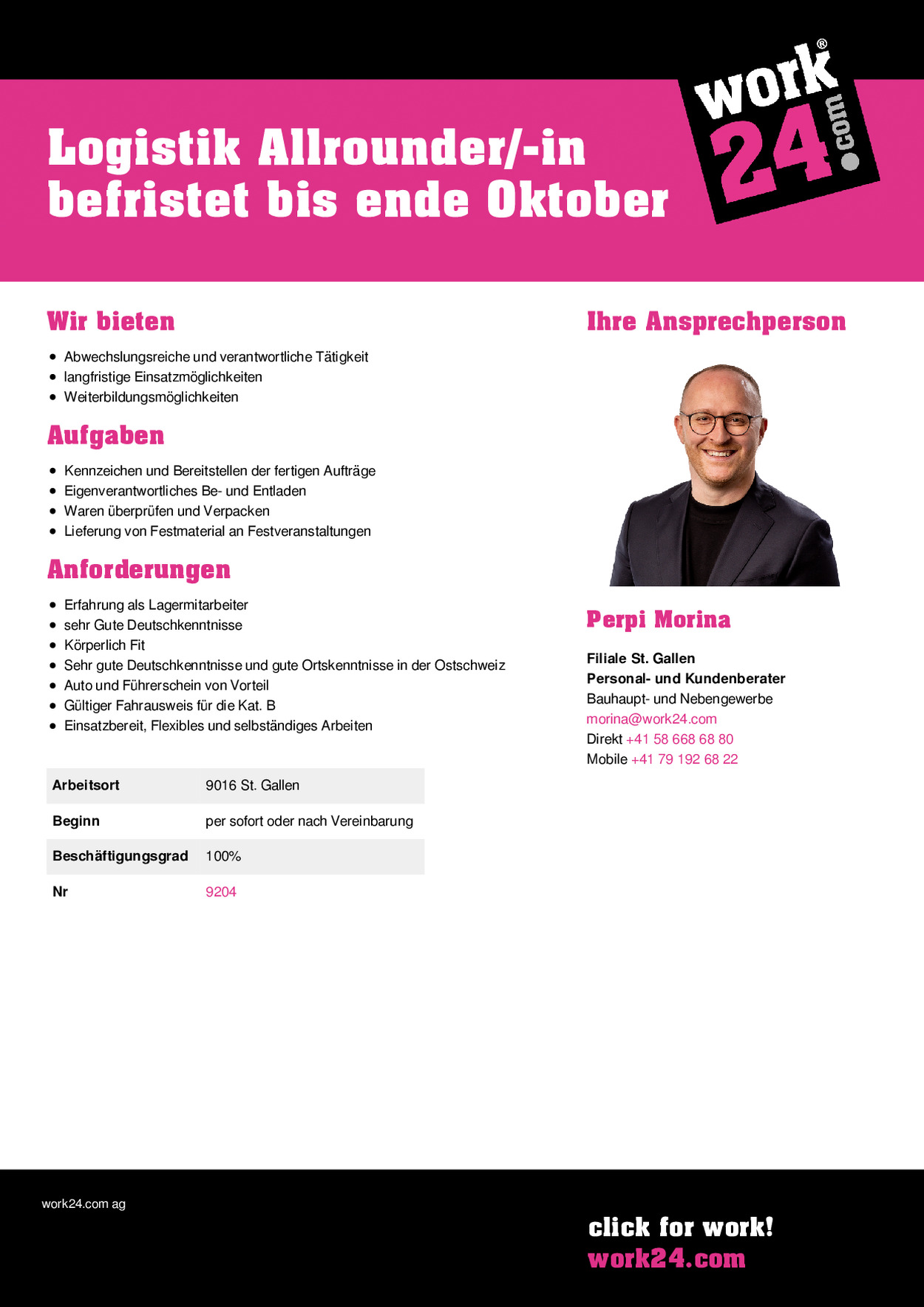 Logistik Allrounder/-in befristet bis ende Oktober in St. Gallen
