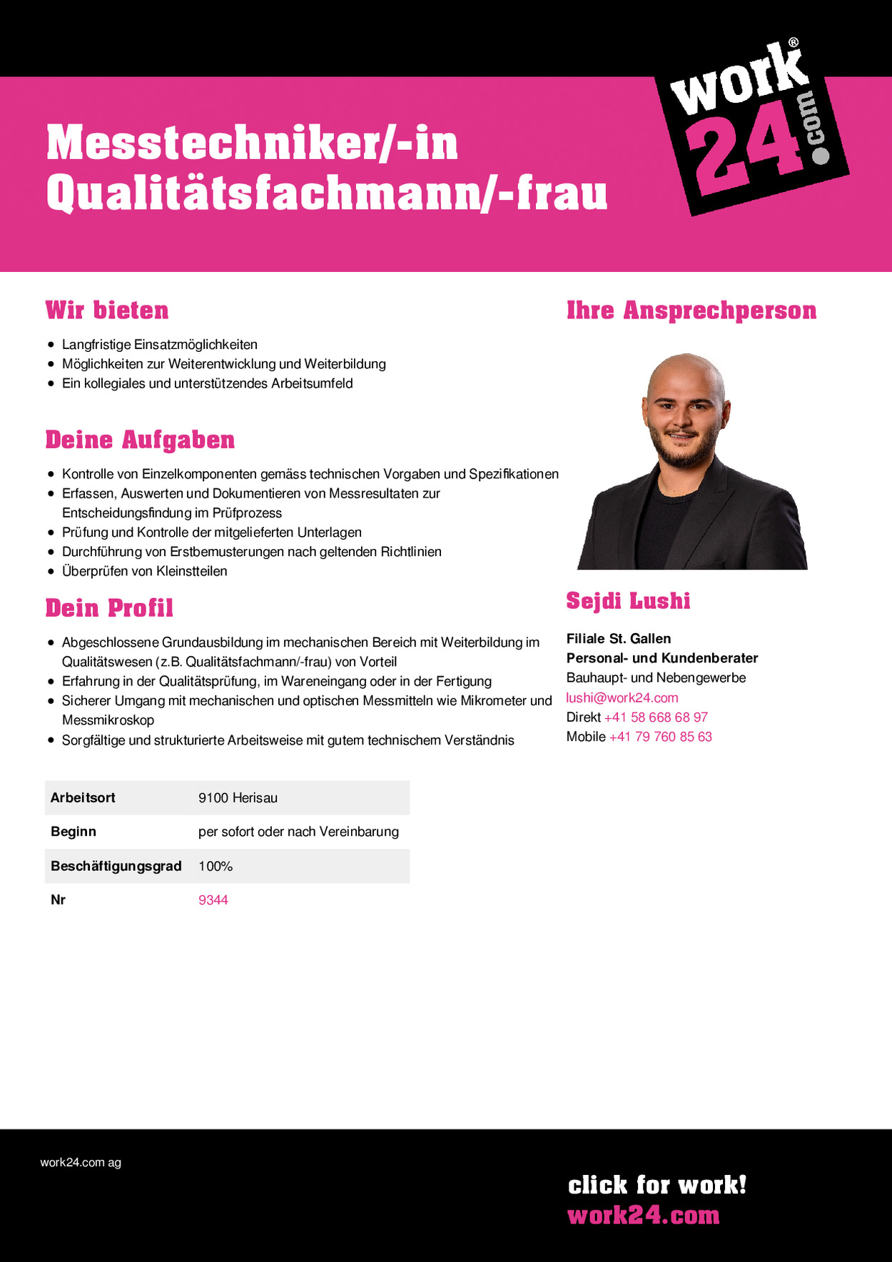 Messtechniker/-in Qualitätsfachmann/-frau in Herisau