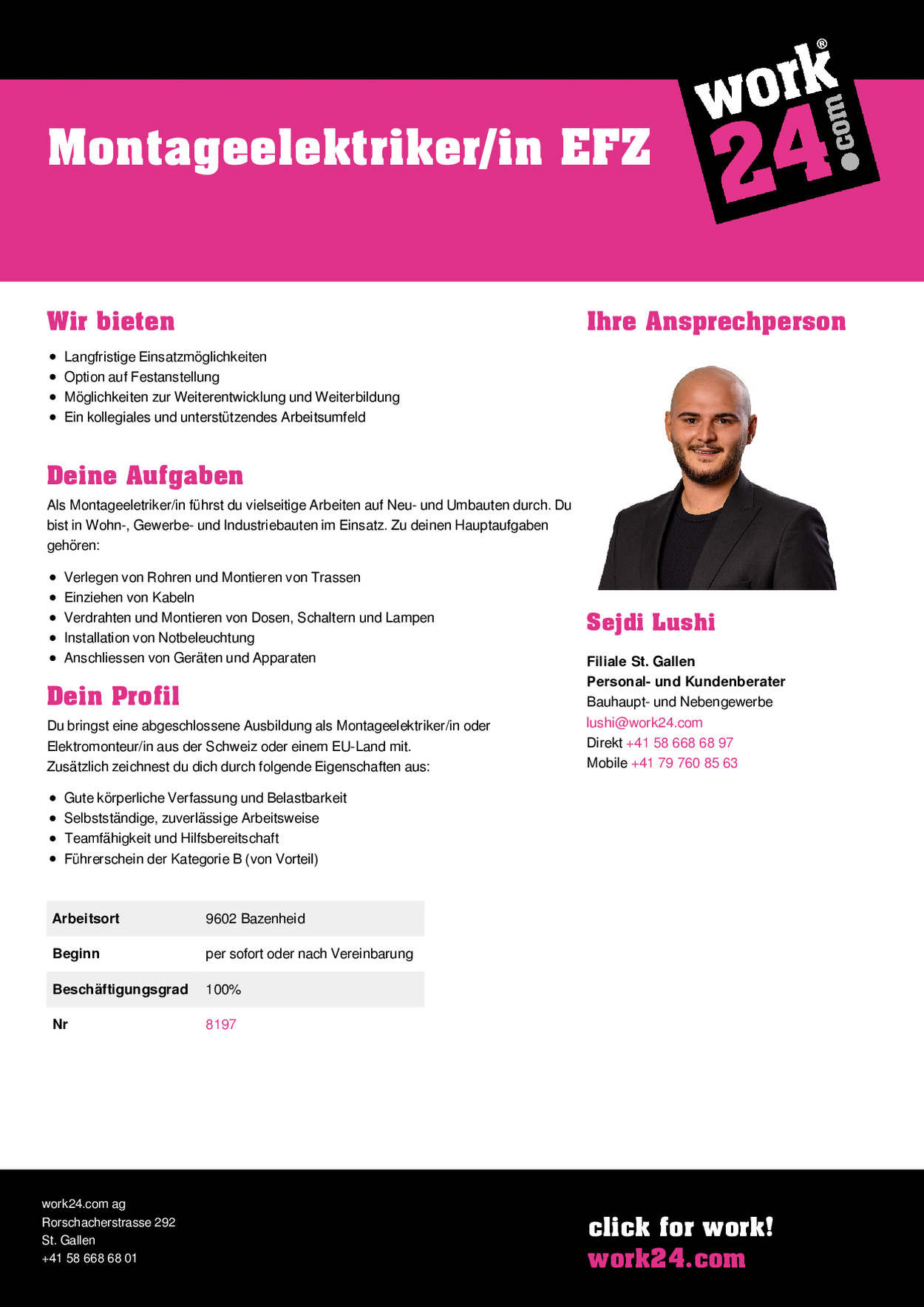 Du bringst eine abgeschlossene Ausbildung als Montageelektriker/in oder Elektromonteur/in aus der Schweiz oder einem EU-Land mit.