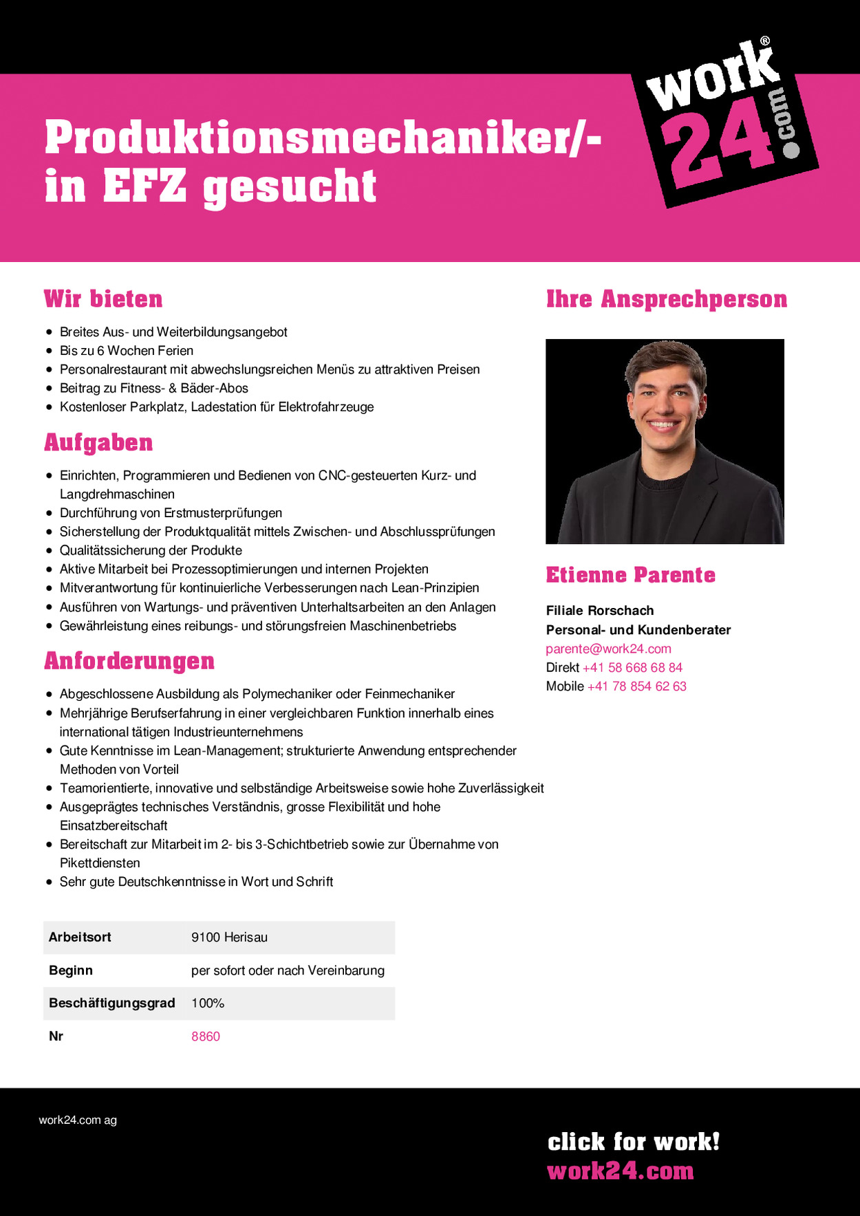 - Abgeschlossene Ausbildung als Polymechaniker oder Feinmechaniker