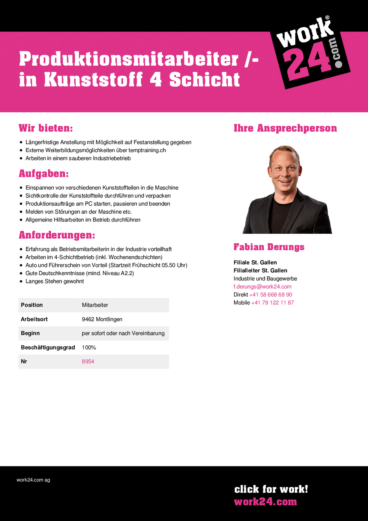 Produktionsmitarbeiter /-in Kunststoff 4 Schicht in Montlingen