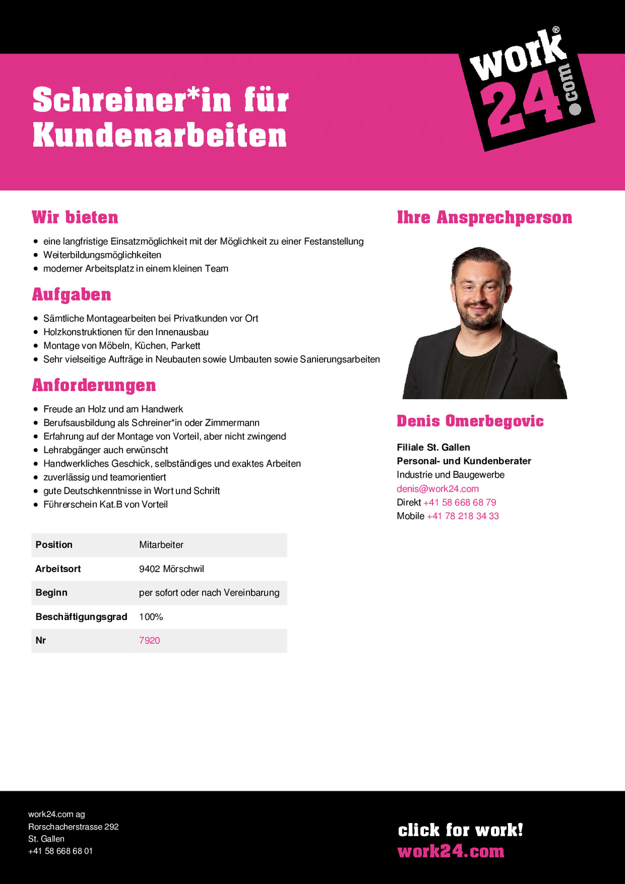 Schreiner*in für Kundenarbeiten in Mörschwil